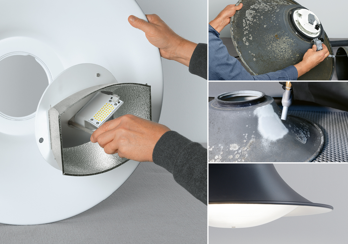 Neben der Ausstattung mit zeitgemäßer Lichttechnik werden die Leuchten im Werk nach langer Einsatzzeit professionell aufgearbeitet. Optik und Technik entsprechen nach dem Service einem Neuprodukt.