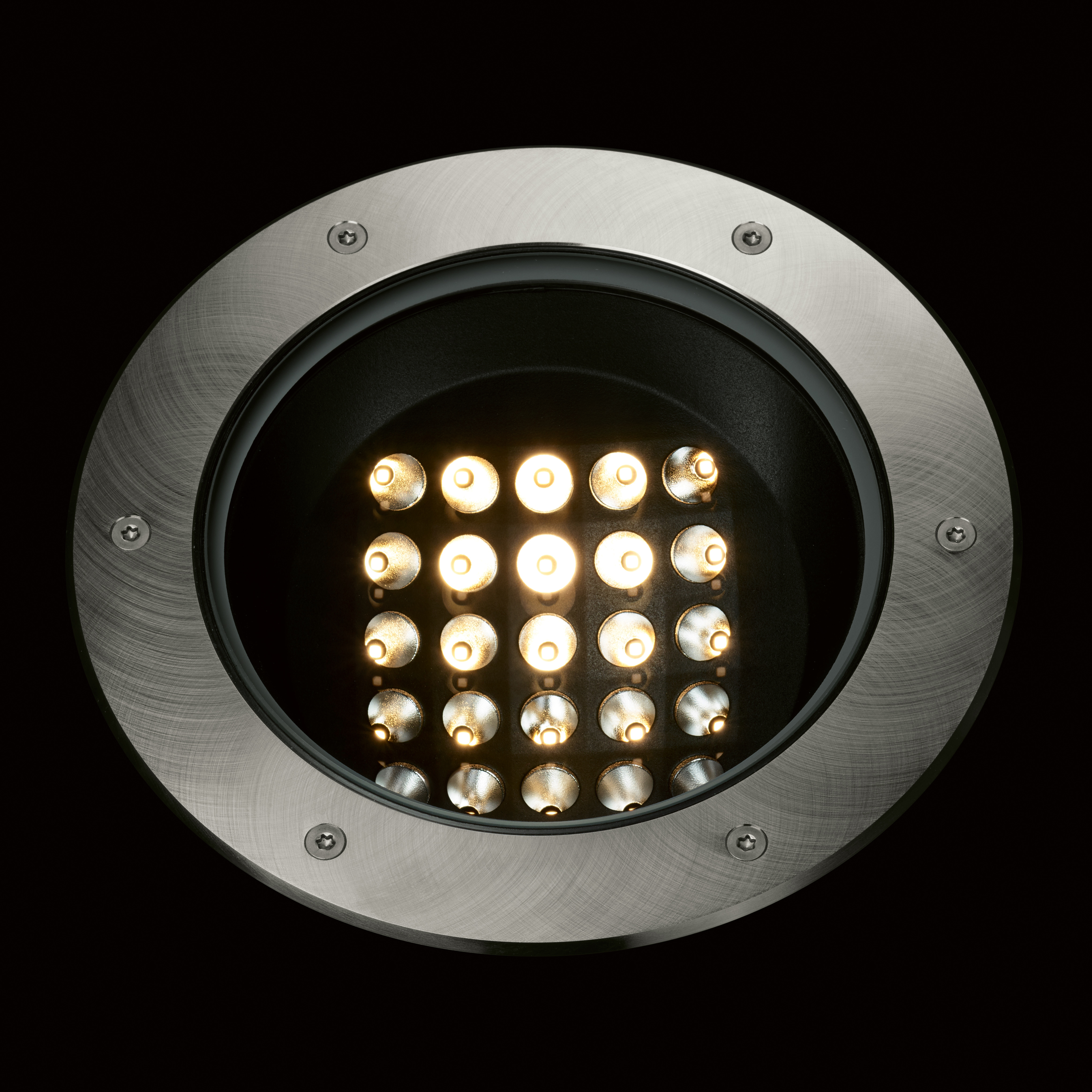 Ein innovatives optisches System erweitert die BEGA Bodeneinbauleuchten um eine gezielte Lösung für individuelle Lichtanforderungen. Die Matrix-Scheinwerfer mit dynamisch einstellbarer Lichtstärkeverteilung verfügen über eine Matrix mit 25 einzeln ansteuerbaren LEDs, die in einem 5x5-Raster angeordnet sind. Das ermöglicht die präzise Einstellung von Lichtstärkeverteilungen und -szenen – sei es symmetrisch, asymmetrisch, eng- oder breitstrahlend. Diese lassen sich auch dynamisch in einer Sequenz abspielen.