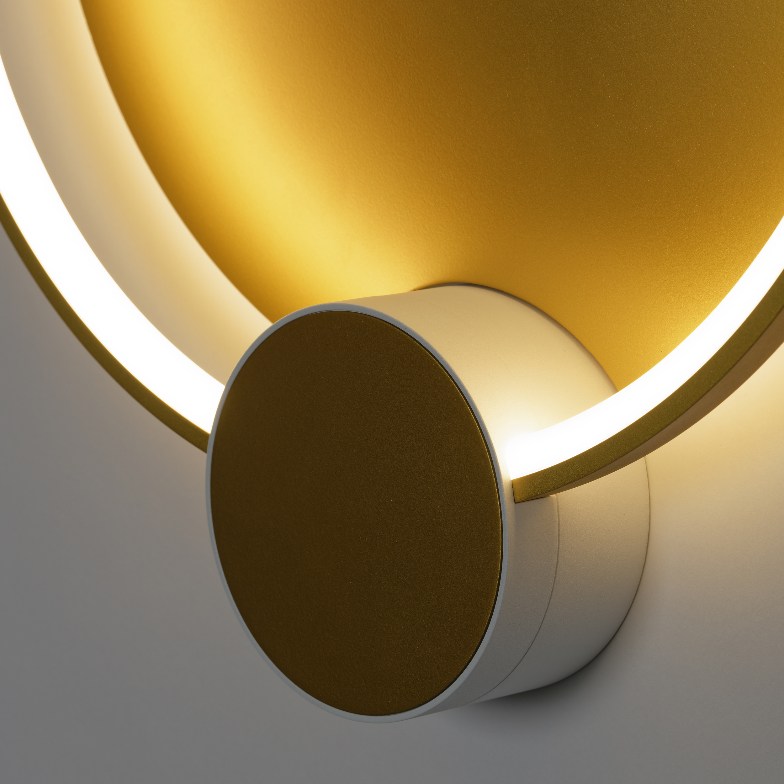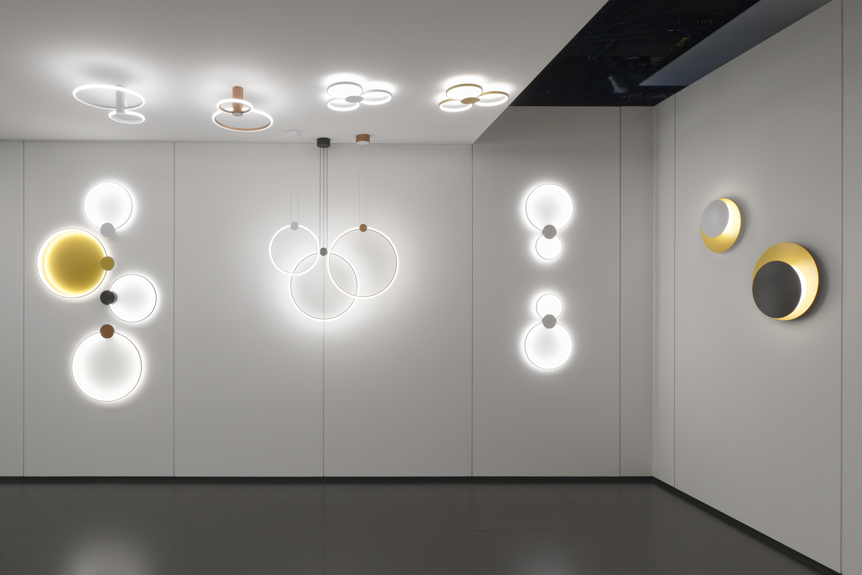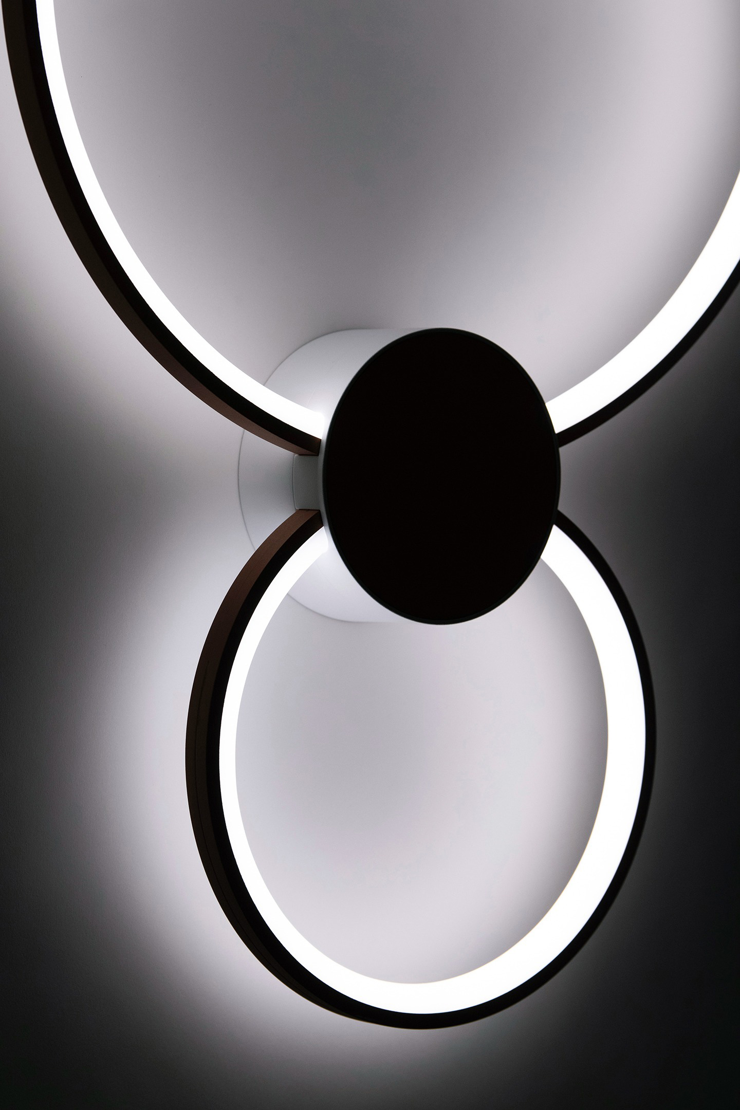 Leuchten sind immer auch ein Gestaltungsmittel, hier in Form von Ringleuchten – entweder als dezente Lichtquelle oder unbeleuchtet als Wandskulptur. In asymmetrischer Zweifach- oder symmetrischer Dreifachanordnung entspringen filigrane Leuchtringe einem wandmontierten Zylinder. Je nach Farbwahl erzeugen die Inlays in den Ringen und im Zylinder einen deutlichen Kontrast zur Wand.