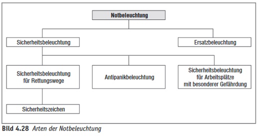 Grundsätzlich gliedert sich die Notbeleuchtung in verschiedene Arten der Sicherheitsbeleuchtung sowie in die Ersatzbeleuchtung (siehe Bild 4.28 und die folgenden Abschnitte).