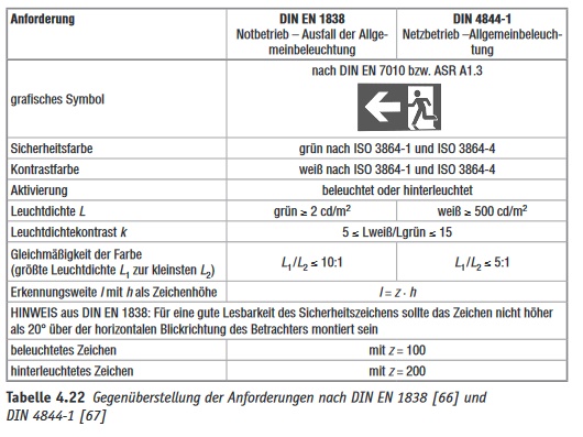 im Verlauf von Rettungswegen und der Kennzeichnung der Notausgänge sind grundsätzlich Sicherheitszeichen nach DIN EN ISO 7010 [86] bzw. nach ASR A1.3 einzusetzen. Diese Kennzeichnung muss bei „aktiver Notbeleuchtung“, das heißt bei gestörter bzw. bei ausgefallener Allgemeinbeleuchtung gut sichtbar und auffällig sein. Aber auch bei intakter Netzstromversorgung der Allgemeinbeleuchtung bzw. in heller Umgebung sind diese Sicherheitszeichen ein wesentlicher Teil des Sicherheitskonzepts eines Gebäudes. Damit die Auffälligkeit der Sicherheitszeichen auch in heller Umgebung ausreichend gut ist, müssen höhere lichttechnische Anforderungen an die Beleuchtung der Sicherheitszeichen erfüllt werden. Sicherheitszeichen bzw. Rettungszeichenleuchten in heller Umgebung, die Bestandteil einer Sicherheitsbeleuchtungsanlage nach DIN V VDE V 0108-100 [68] sind, müssen auch die Anforderungen von DIN 4844-1 [67] einhalten. In Tabelle 4.22 werden die lichttechnischen und gestalterischen Anforderungen an Sicherheitszeichen nach DIN EN 1838 [66] und nach DIN 4844-1 [67] tabellarisch gegenübergestellt.