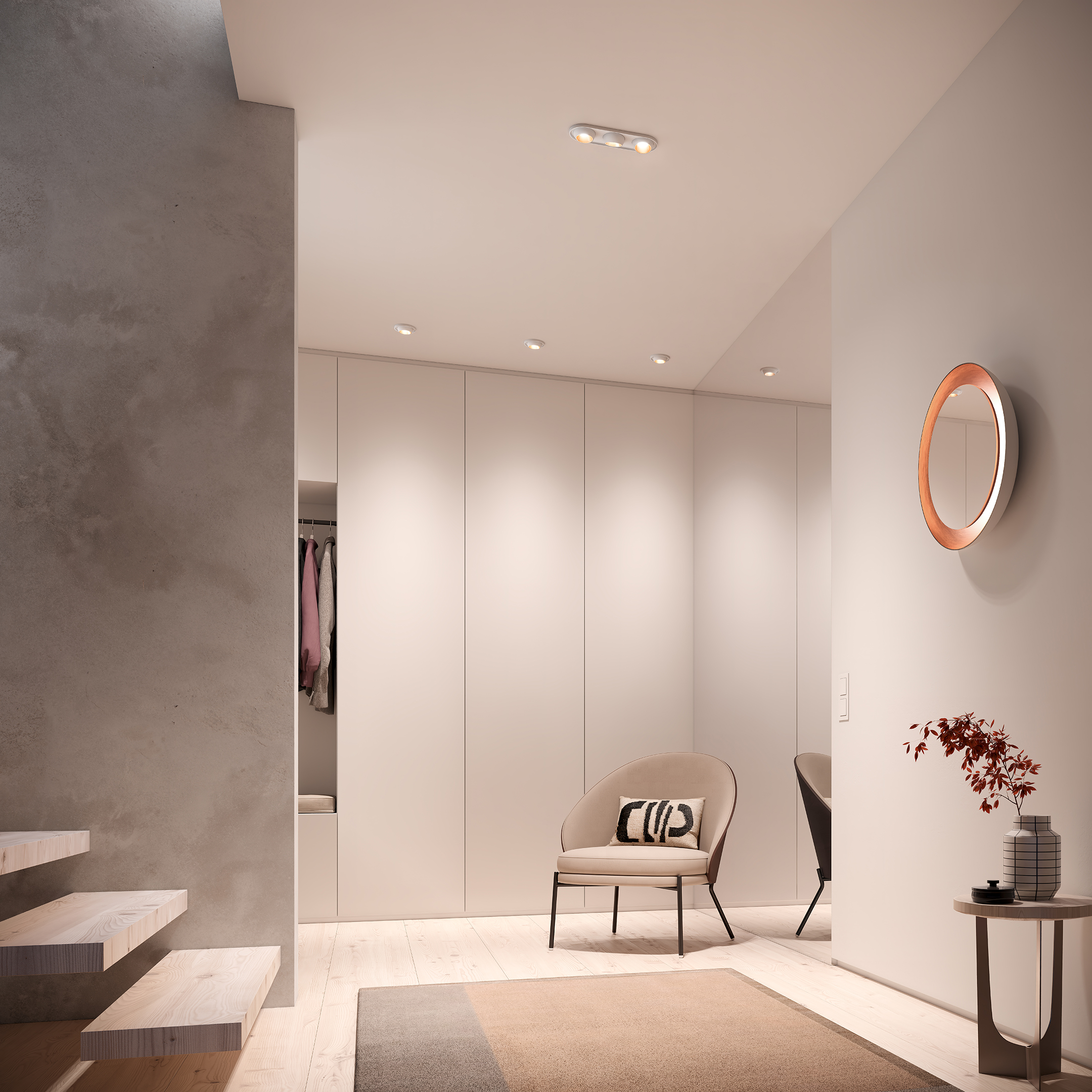 Die Deckeneinbauleuchten des STUDIO LINE Programms zeichnen sich durch ihre Verstellbarkeit aus und ermöglichen dadurch eine separate Ausrichtung. Jede Leuchte kann einzeln nach den persönlichen Bedürfnissen und Anforderungen eingestellt werden, um eine maßgeschneiderte Beleuchtungslösung zu schaffen. Die unterschiedlichen Farbkombinationen erlauben die Abstimmung auf das jeweilige Interieur.